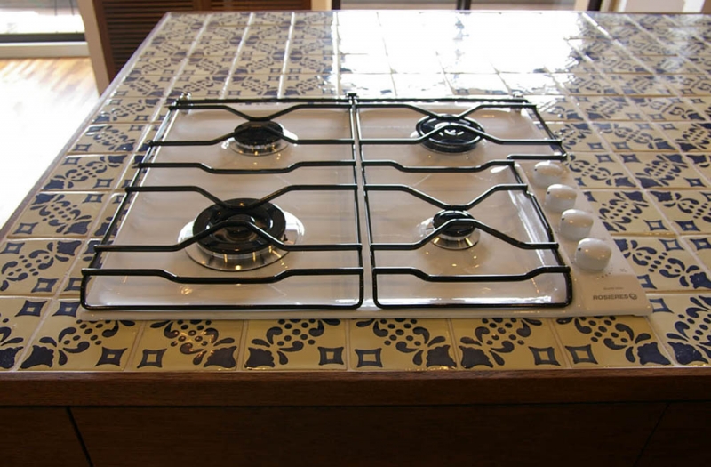 ゆったりとしたリビングスペースを確保するために、ダイニングテーブルは置かず、 キッチンに食事のできるコーナーを備えた、カウンターキッチンを製作しました。 通常、キッチンはテーブルよりやや離れたところにある場合が多いですが、 こちらの場合、作る人もいただく人も、向かい合って会話をしながらお料理を楽しめます。 カウンター天板にはスペインタイルを貼り、ホーローのシンクにロジエールのガスコンロを備えています。