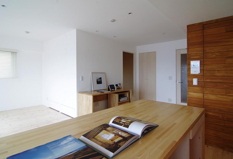 立地、環境などの諸条件が気に入り購入したマンションでも、間取りや使われている素材が気に入らないということはよくあること。「素足がきもちよい家」は、もともとバルコニー側にバスルーム、リビング、和室と3部屋が配置されていたために、リビングがとても狭くて暗い感じがしました。今回の計画では、ユニットバスの位置を動かし、リビングを南側のバルコニーに面して拡張。オープンキッチンの明るいリビングダイニングとなりました。無垢のパイン床材はお客様がオイルフィニッシュを施し、以前の冷たいフローリングとは感触が違います。壁は漆喰で、ニュアンスのある表情を見せてくれます。