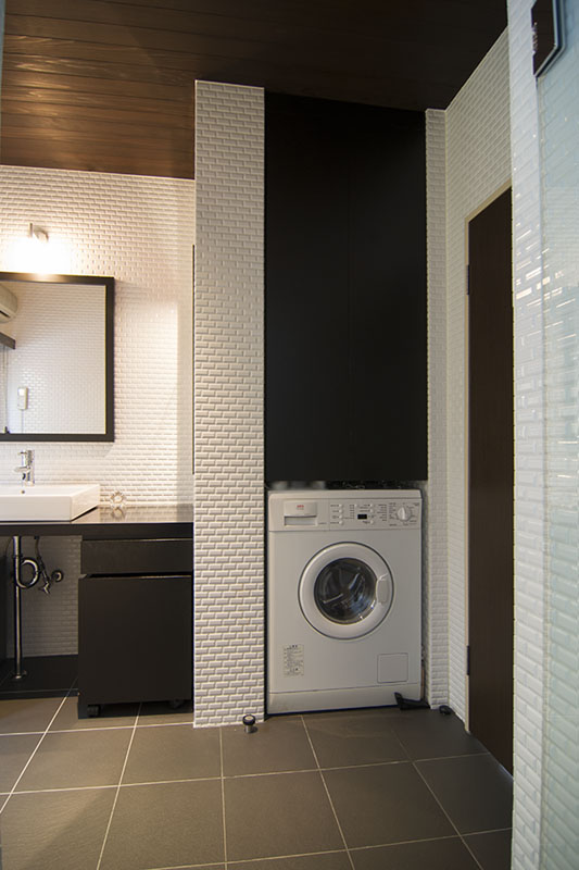 築40年の木造住宅。浴室は10数年前にリフォームされていましたが、暗くくつろげない雰囲気でした。今回の計画では、浴槽の高さにあわせて庭を見ることの出来るようにFIX窓を設けました。浴槽は Villeroy&Boch社のもの。洗面室は洗濯スペース、ストックスペース、洗面台を造作。レッドシダーの天井に木製サッシと木製ブラインド、白いタイルと木のブラウンが洗練された印象を与えます。